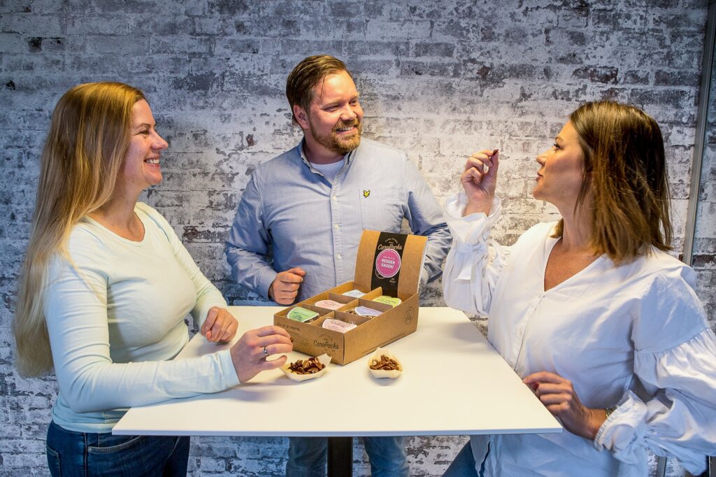 Gründer og daglig leder i TasteForge, Stig Ola Johansen, snakker produktinnovasjon med Christin Westby (tv) og Christina Øverland-Engelsen fra Minnesota Brand Agency. Foto: CarePacks